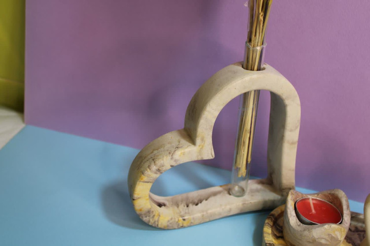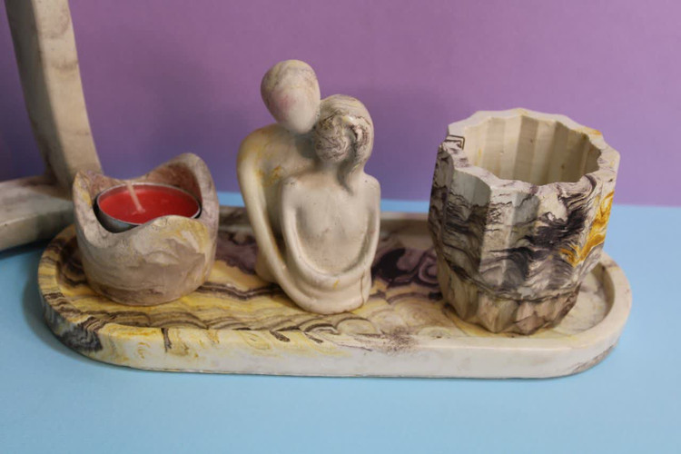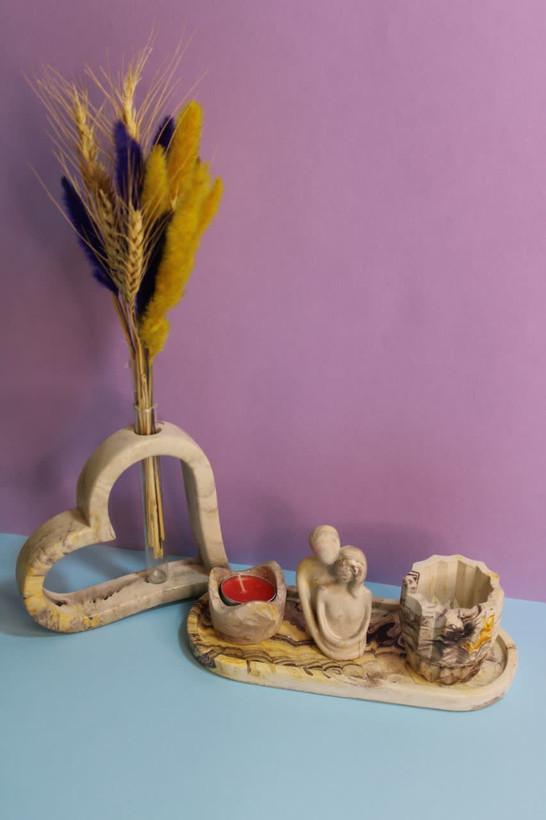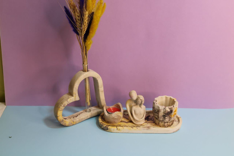 متریال اولیه استفاده شده در محصولات و اکسسوری موجود در فروشگاه از جنس سنگ مصنوعی است که ترکیبی از سنگ و مواد طبیعی همراه با موادی برای بهبود کیفیت و سبک شدن وزن این محصولات می باشد. رنگ های ایجاد شده در اکثر محصولات از دل طبیعت استخراج شده اند و به شکلی خلاقانه و هنرمندانه در لوازم تزیینی استفاده می شوند.